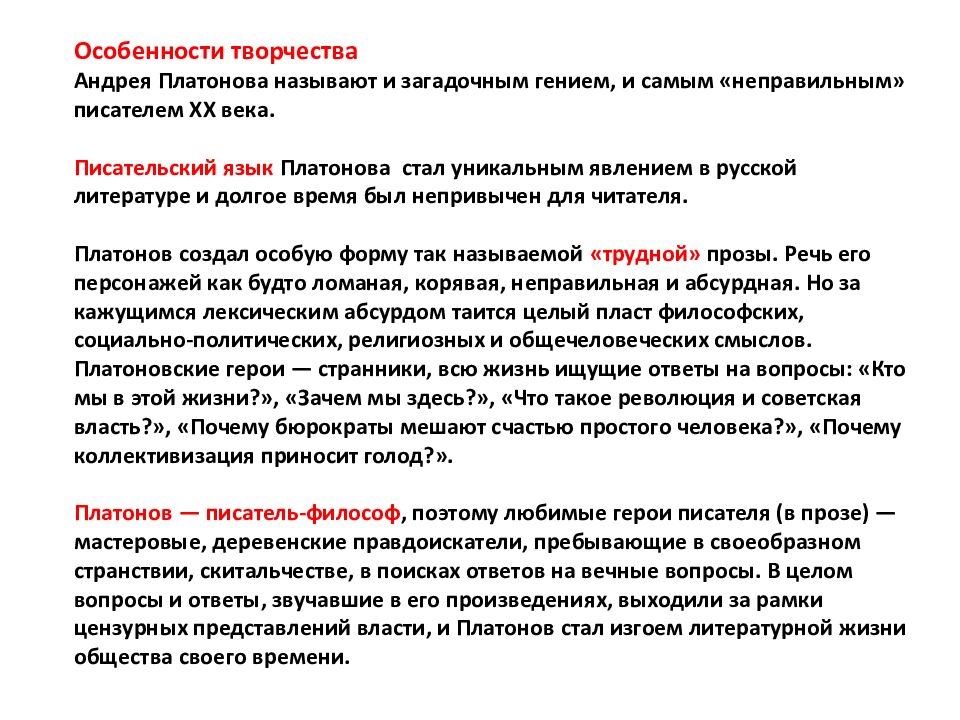 Особенности творчества Андрея Платонова называют и загадочным гением, и самым «неправильным» писателем XX века. Писательский язык Платонова стал уникальным явлением в русской литературе и долгое время был непривычен для читателя. Платонов создал особую форму так называемой «трудной» прозы. Речь его персонажей как будто ломаная, корявая, неправильная и абсурдная. Но за кажущимся лексическим абсурдом таится целый пласт философских, социально-политических, религиозных и общечеловеческих смыслов. Платоновские герои — странники, всю жизнь ищущие ответы на вопросы: «Кто мы в этой жизни?», «Зачем мы здесь?», «Что такое революция и советская власть?», «Почему бюрократы мешают счастью простого человека?», «Почему коллективизация приносит голод ?». Платонов — писатель-философ, поэтому любимые герои писателя (в прозе) — мастеровые, деревенские правдоискатели, пребывающие в своеобразном странствии, скитальчестве, в поисках ответов на вечные вопросы. В целом вопросы и ответы, звучавшие в его произведениях, выходили за рамки цензурных представлений власти, и Платонов стал изгоем литературной жизни общества своего времени.