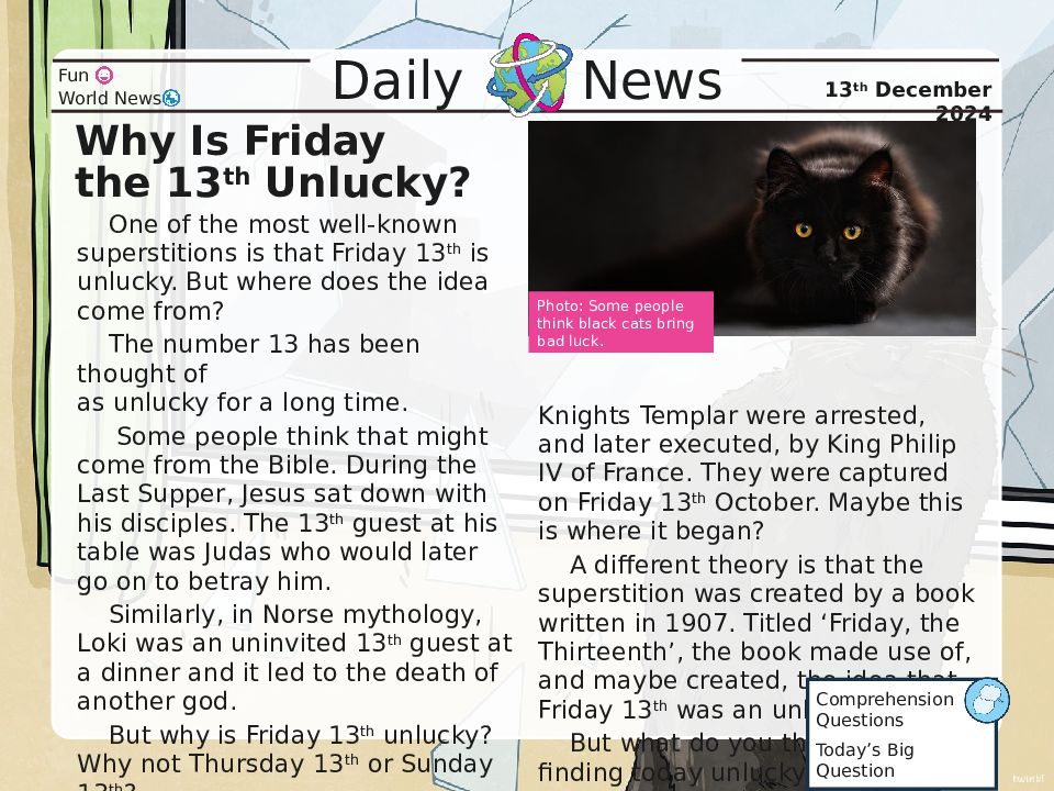 One of the most well-known superstitions is that Friday 13 th is unlucky. But where does the idea come from? The number 13 has been thought of as unlucky for a long time. Some people think that might come from the Bible. During the Last Supper, Jesus sat down with his disciples. The 13 th guest at his table was Judas who would later go on to betray him. Similarly, in Norse mythology, Loki was an uninvited 13 th guest at a dinner and it led to the death of another god. But why is Friday 13 th unlucky? Why not Thursday 13 th or Sunday 13 th ? One story is that in 1307 some Knights Templar were arrested, and later executed, by King Philip IV of France. They were captured on Friday 13 th October. Maybe this is where it began? A different theory is that the superstition was created by a book written in 1907. Titled ‘Friday, the Thirteenth’, the book made use of, and maybe created, the idea that Friday 13 th was an unlucky day. But what do you think? Are you finding today unlucky? Why Is Friday the 13 th Unlucky? Photo: Some people think black cats bring bad luck. Daily News Fun World News 13 th December 2024 Comprehension Questions Today’s Big Question