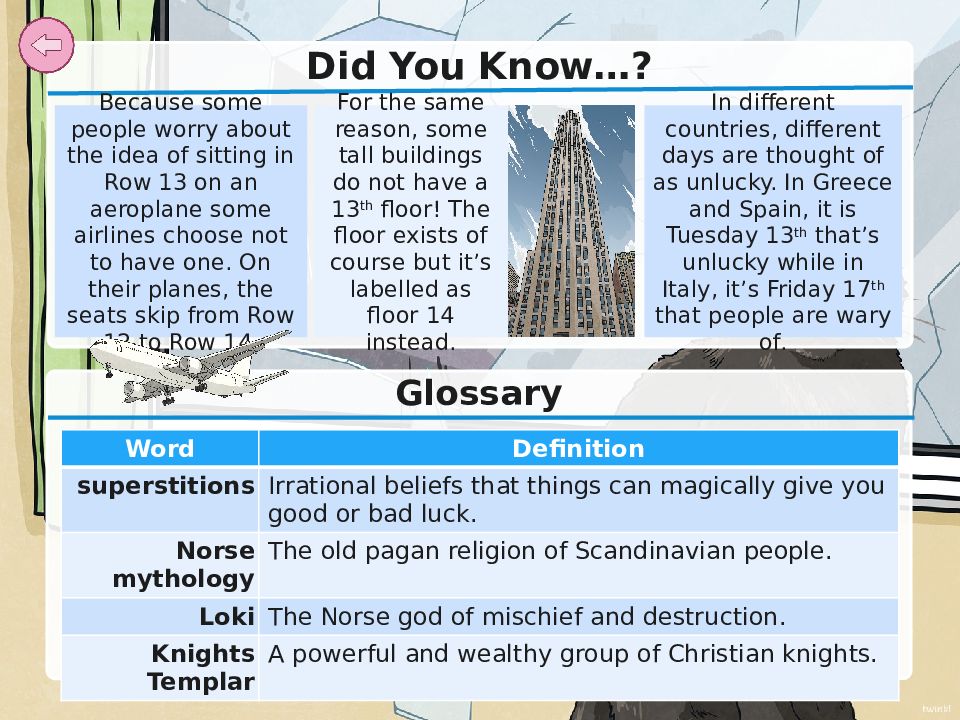 Word Definition superstitions Irrational beliefs that things can magically give you good or bad luck. Norse mythology The old pagan religion of Scandinavian people. Loki The Norse god of mischief and destruction. Knights Templar A powerful and wealthy group of Christian knights. Glossary Did You Know…? Because some people worry about the idea of sitting in Row 13 on an aeroplane some airlines choose not to have one. On their planes, the seats skip from Row 12 to Row 14. In different countries, different days are thought of as unlucky. In Greece and Spain, it is Tuesday 13 th that’s unlucky while in Italy, it’s Friday 17 th that people are wary of. For the same reason, some tall buildings do not have a 13 th floor! The floor exists of course but it’s labelled as floor 14 instead.