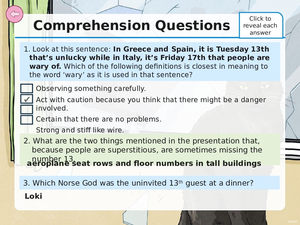3. Which Norse God was the uninvited 13 th guest at a dinner? 1. Look at this sentence: In Greece and Spain, it is Tuesday 13th that’s unlucky while in Italy, it’s Friday 17th that people are wary of. Which of the following definitions is closest in meaning to the word ‘wary’ as it is used in that sentence? 2. What are the two things mentioned in the presentation that, because people are superstitious, are sometimes missing the number 13. Loki aeroplane seat rows and floor numbers in tall buildings Click to reveal each answer Observing something carefully. Act with caution because you think that there might be a danger involved. Certain that there are no problems. Strong and stiff like wire.