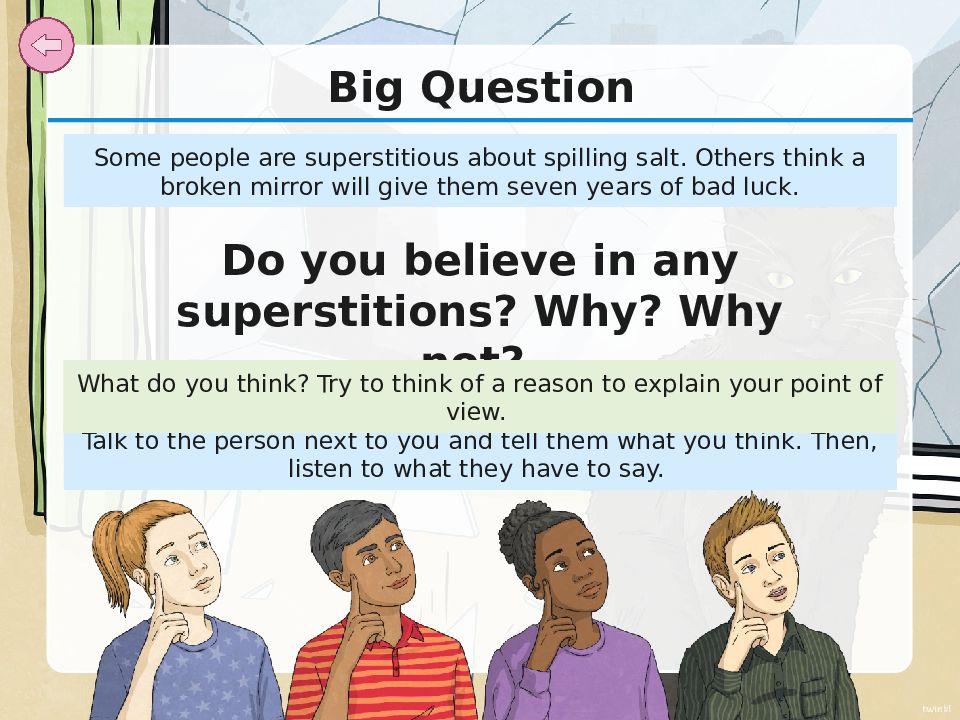 Do you believe in any superstitions? Why? Why not? Talk to the person next to you and tell them what you think. Then, listen to what they have to say. Some people are superstitious about spilling salt. Others think a broken mirror will give them seven years of bad luck. What do you think? Try to think of a reason to explain your point of view.