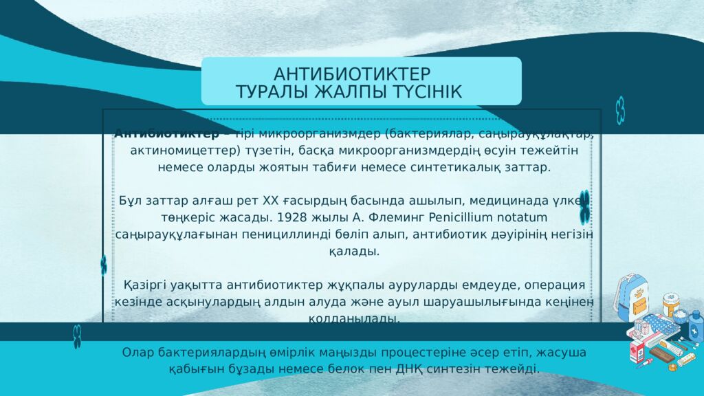 АНТИБИОТИКТЕР ТУРАЛЫ ЖАЛПЫ ТҮСІНІК Антибиотиктер – тірі микроорганизмдер (бактериялар, саңырауқұлақтар, актиномицеттер) түзетін, басқа микроорганизмдердің өсуін тежейтін немесе оларды жоятын табиғи немесе синтетикалық заттар. Бұл заттар алғаш рет ХХ ғасырдың басында ашылып, медицинада үлкен төңкеріс жасады. 1928 жылы А. Флеминг Penicillium notatum саңырауқұлағынан пенициллинді бөліп алып, антибиотик дәуірінің негізін қалады. Қазіргі уақытта антибиотиктер жұқпалы ауруларды емдеуде, операция кезінде асқынулардың алдын алуда және ауыл шаруашылығында кеңінен қолданылады. Олар бактериялардың өмірлік маңызды процестеріне әсер етіп, жасуша қабығын бұзады немесе белок пен ДНҚ синтезін тежейді.