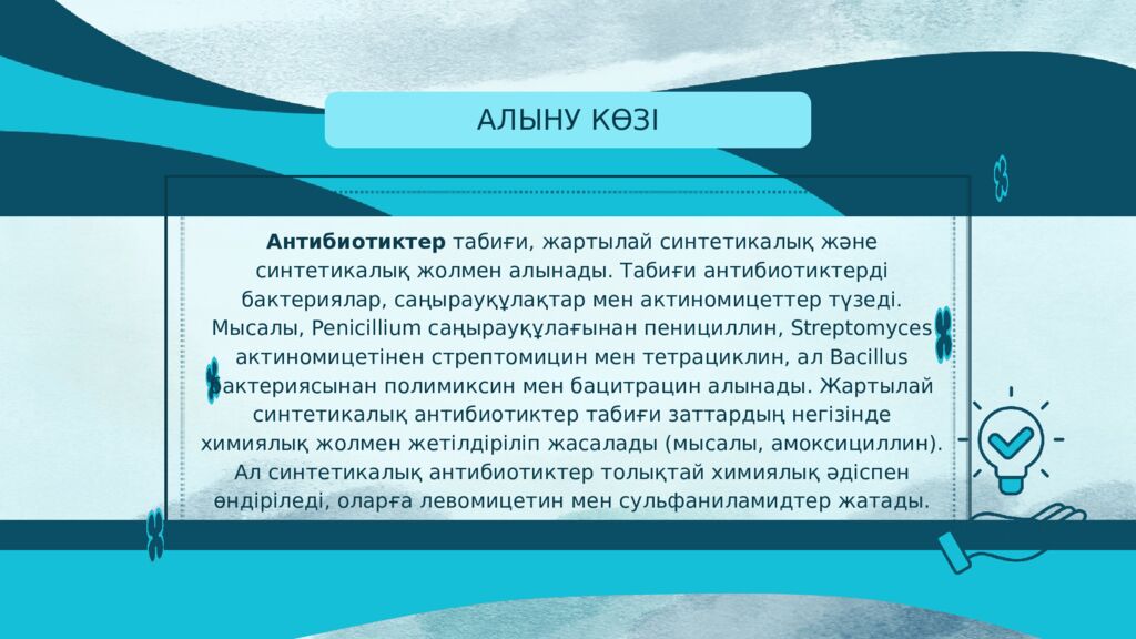 АЛЫНУ КӨЗІ Антибиотиктер табиғи, жартылай синтетикалық және синтетикалық жолмен алынады. Табиғи антибиотиктерді бактериялар, саңырауқұлақтар мен актиномицеттер түзеді. Мысалы, Penicillium саңырауқұлағынан пенициллин, Streptomyces актиномицетінен стрептомицин мен тетрациклин, ал Bacillus бактериясынан полимиксин мен бацитрацин алынады. Жартылай синтетикалық антибиотиктер табиғи заттардың негізінде химиялық жолмен жетілдіріліп жасалады (мысалы, амоксициллин). Ал синтетикалық антибиотиктер толықтай химиялық әдіспен өндіріледі, оларға левомицетин мен сульфаниламидтер жатады.