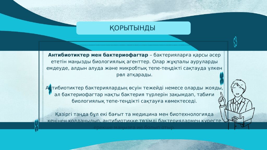 ҚОРЫТЫНДЫ Антибиотиктер мен бактериофагтар – бактерияларға қарсы әсер ететін маңызды биологиялық агенттер. Олар жұқпалы ауруларды емдеуде, алдын алуда және микробтық тепе-теңдікті сақтауда үлкен рөл атқарады. Антибиотиктер бактериялардың өсуін тежейді немесе оларды жояды, ал бактериофагтар нақты бактерия түрлерін зақымдап, табиғи биологиялық тепе-теңдікті сақтауға көмектеседі. Қазіргі таңда бұл екі бағыт та медицина мен биотехнологияда кеңінен қолданылып, антибиотикке төзімді бактериялармен күресте ерекше маңызға ие болып отыр.