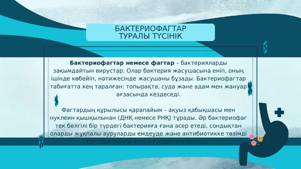 БАКТЕРИОФАГТАР ТУРАЛЫ ТҮСІНІК Бактериофагтар немесе фагтар – бактерияларды зақымдайтын вирустар. Олар бактерия жасушасына еніп, оның ішінде көбейіп, нәтижесінде жасушаны бұзады. Бактериофагтар табиғатта кең таралған: топырақта, суда және адам мен жануар ағзасында кездеседі. Фагтардың құрылысы қарапайым – ақуыз қабықшасы мен нуклеин қышқылынан (ДНҚ немесе РНҚ) тұрады. Әр бактериофаг тек белгілі бір түрдегі бактерияға ғана әсер етеді, сондықтан оларды жұқпалы ауруларды емдеуде және антибиотикке төзімді бактерияларға қарсы қолдануға болады.