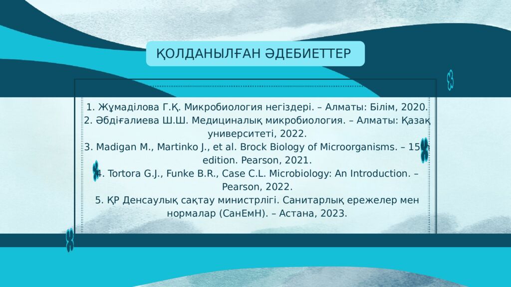ҚОЛДАНЫЛҒАН ӘДЕБИЕТТЕР 1. Жұмаділова Г.Қ. Микробиология негіздері. – Алматы: Білім, 2020. 2. Әбдіғалиева Ш.Ш. Медициналық микробиология. – Алматы: Қазақ университеті, 2022. 3. Madigan M., Martinko J., et al. Brock Biology of Microorganisms. – 15th edition. Pearson, 2021. 4. Tortora G.J., Funke B.R., Case C.L. Microbiology: An Introduction. – Pearson, 2022. 5. ҚР Денсаулық сақтау министрлігі. Санитарлық ережелер мен нормалар (СанЕмН). – Астана, 2023.