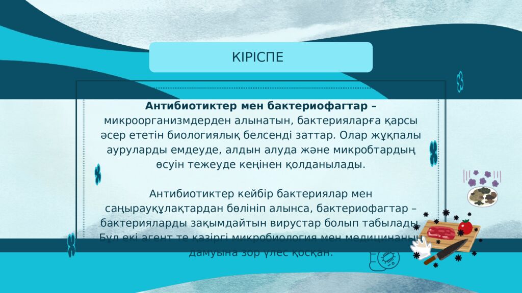 КІРІСПЕ Антибиотиктер мен бактериофагтар – микроорганизмдерден алынатын, бактерияларға қарсы әсер ететін биологиялық белсенді заттар. Олар жұқпалы ауруларды емдеуде, алдын алуда және микробтардың өсуін тежеуде кеңінен қолданылады. Антибиотиктер кейбір бактериялар мен саңырауқұлақтардан бөлініп алынса, бактериофагтар – бактерияларды зақымдайтын вирустар болып табылады. Бұл екі агент те қазіргі микробиология мен медицинаның дамуына зор үлес қосқан.