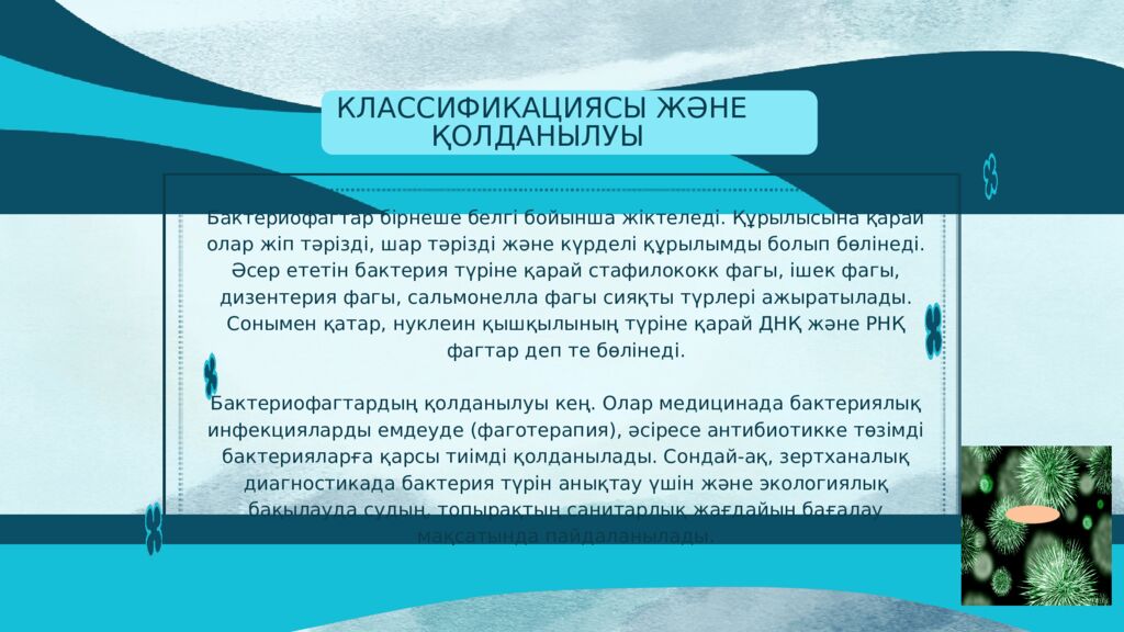 КЛАССИФИКАЦИЯСЫ ЖӘНЕ ҚОЛДАНЫЛУЫ Бактериофагтар бірнеше белгі бойынша жіктеледі. Құрылысына қарай олар жіп тәрізді, шар тәрізді және күрделі құрылымды болып бөлінеді. Әсер ететін бактерия түріне қарай стафилококк фагы, ішек фагы, дизентерия фагы, сальмонелла фагы сияқты түрлері ажыратылады. Сонымен қатар, нуклеин қышқылының түріне қарай ДНҚ және РНҚ фагтар деп те бөлінеді. Бактериофагтардың қолданылуы кең. Олар медицинада бактериялық инфекцияларды емдеуде (фаготерапия), әсіресе антибиотикке төзімді бактерияларға қарсы тиімді қолданылады. Сондай-ақ, зертханалық диагностикада бактерия түрін анықтау үшін және экологиялық бақылауда судың, топырақтың санитарлық жағдайын бағалау мақсатында пайдаланылады.