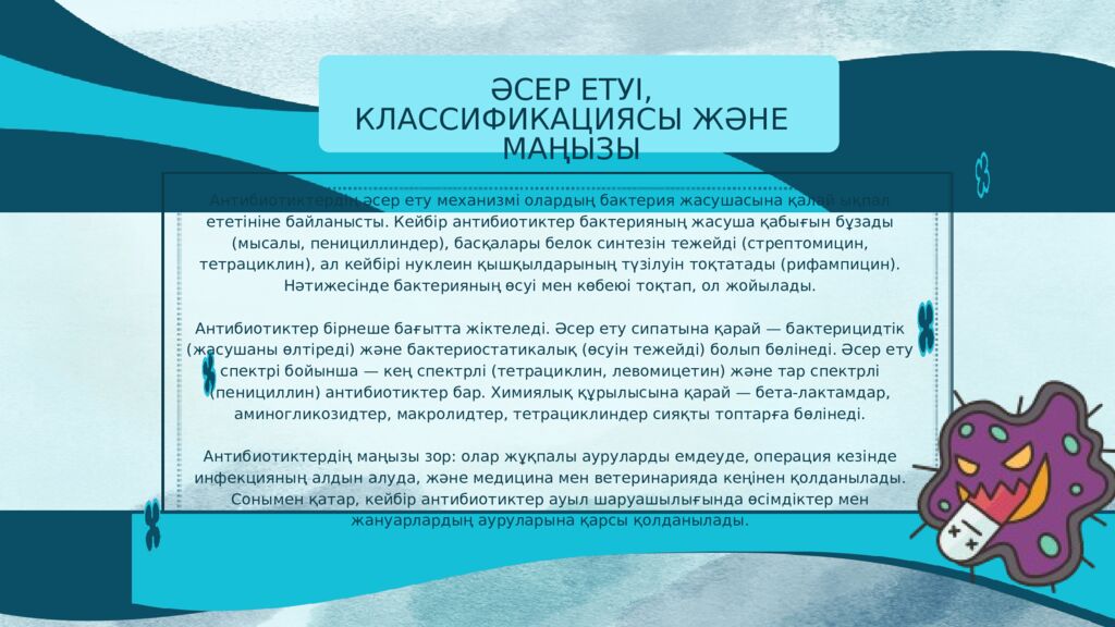 ӘСЕР ЕТУІ, КЛАССИФИКАЦИЯСЫ ЖӘНЕ МАҢЫЗЫ Антибиотиктердің әсер ету механизмі олардың бактерия жасушасына қалай ықпал ететініне байланысты. Кейбір антибиотиктер бактерияның жасуша қабығын бұзады (мысалы, пенициллиндер), басқалары белок синтезін тежейді (стрептомицин, тетрациклин), ал кейбірі нуклеин қышқылдарының түзілуін тоқтатады (рифампицин). Нәтижесінде бактерияның өсуі мен көбеюі тоқтап, ол жойылады. Антибиотиктер бірнеше бағытта жіктеледі. Әсер ету сипатына қарай — бактерицидтік (жасушаны өлтіреді) және бактериостатикалық (өсуін тежейді) болып бөлінеді. Әсер ету спектрі бойынша — кең спектрлі (тетрациклин, левомицетин) және тар спектрлі (пенициллин) антибиотиктер бар. Химиялық құрылысына қарай — бета-лактамдар, аминогликозидтер, макролидтер, тетрациклиндер сияқты топтарға бөлінеді. Антибиотиктердің маңызы зор: олар жұқпалы ауруларды емдеуде, операция кезінде инфекцияның алдын алуда, және медицина мен ветеринарияда кеңінен қолданылады. Сонымен қатар, кейбір антибиотиктер ауыл шаруашылығында өсімдіктер мен жануарлардың ауруларына қарсы қолданылады.
