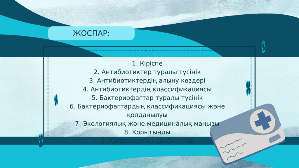 ЖОСПАР: 1. Кіріспе 2. Антибиотиктер туралы түсінік 3. Антибиотиктердің алыну көздері 4. Антибиотиктердің классификациясы 5. Бактериофагтар туралы түсінік 6. Бактериофагтардың классификациясы және қолданылуы 7. Экологиялық және медициналық маңызы 8. Қорытынды 9. Қолданылған әдебиеттер