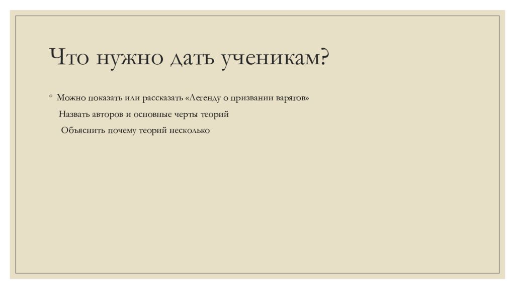 Можно показать или рассказать «Легенду о призвании варягов» Назвать авторов и основные черты теорий Объяснить почему теорий несколько