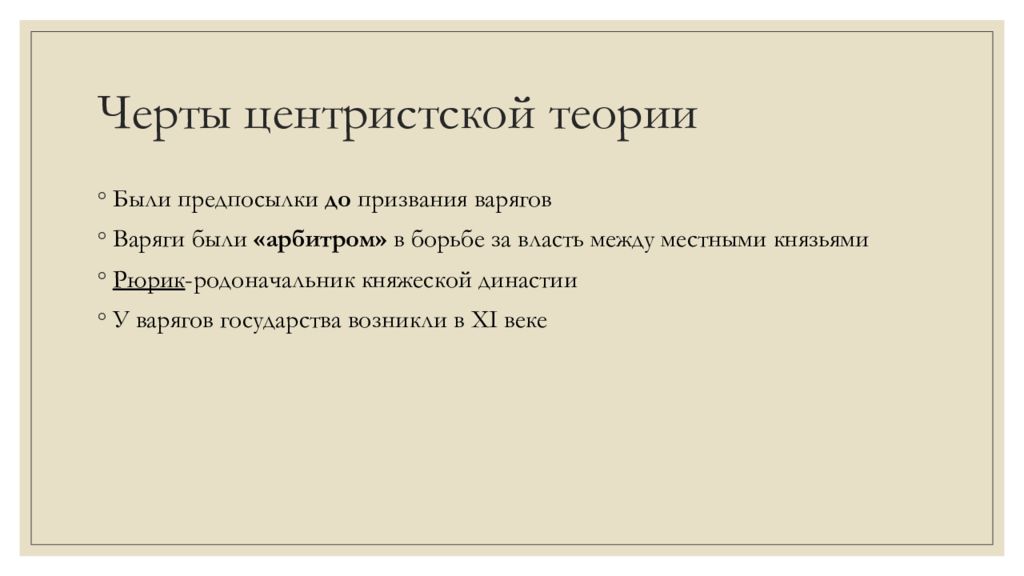 Были предпосылки до призвания варягов Варяги были «арбитром» в борьбе за власть между местными князьями Рюрик -родоначальник княжеской династии У варягов государства возникли в XI веке