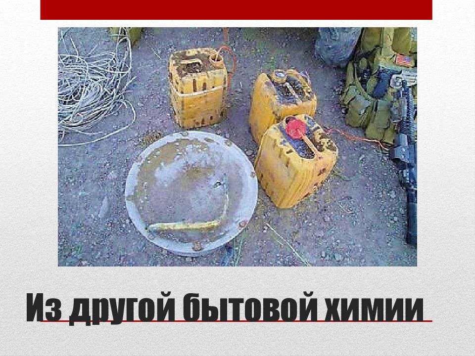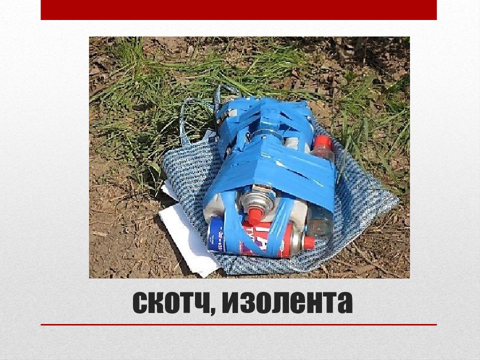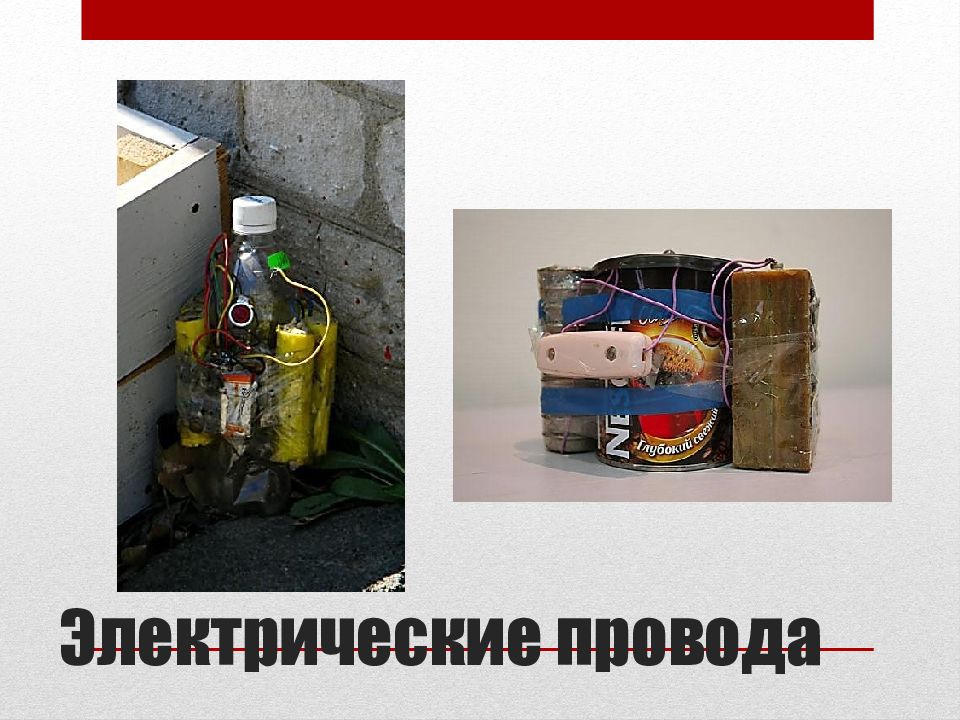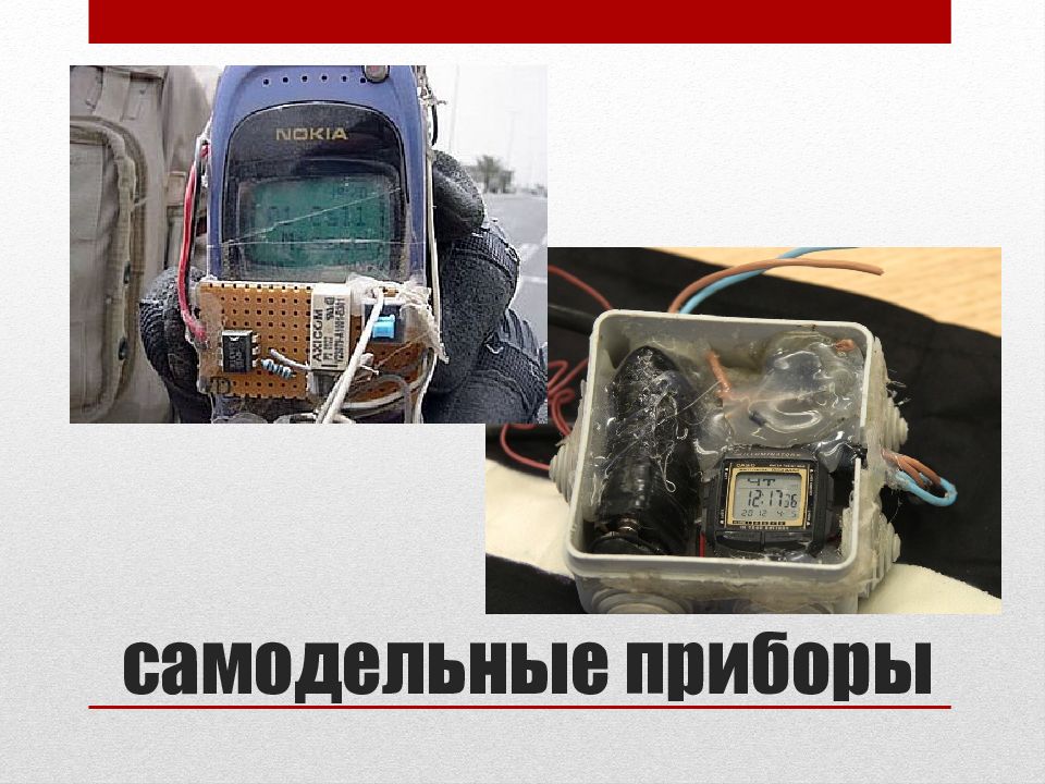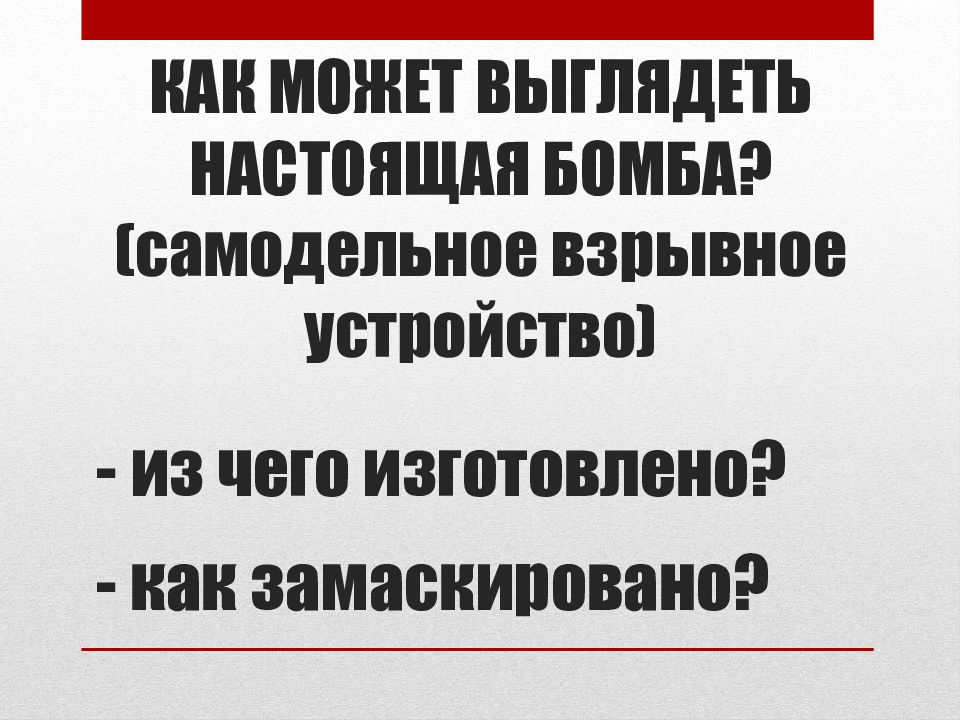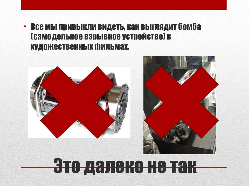 Слайд 7: КАК МОЖЕТ ВЫГЛЯДЕТЬ НАСТОЯЩАЯ БОМБА? (самодельное в зрывное устройство)