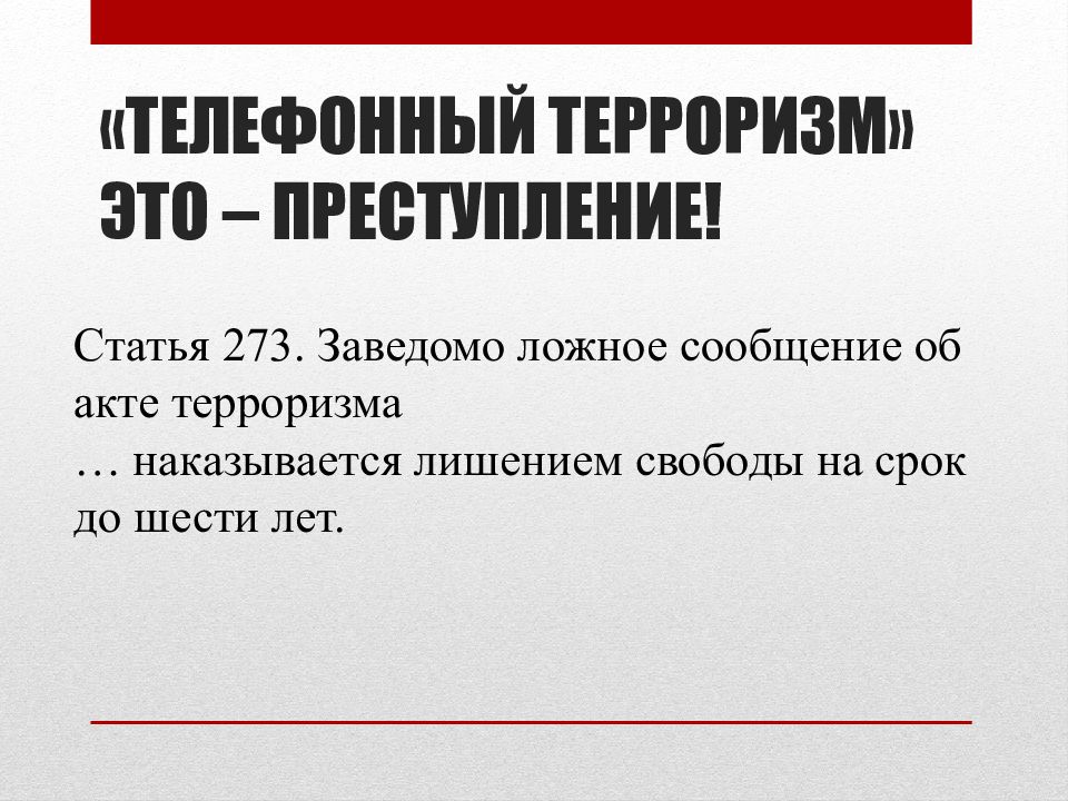 Статья 273. Заведомо ложное сообщение об акте терроризма … наказывается лишением свободы на срок до шести лет.