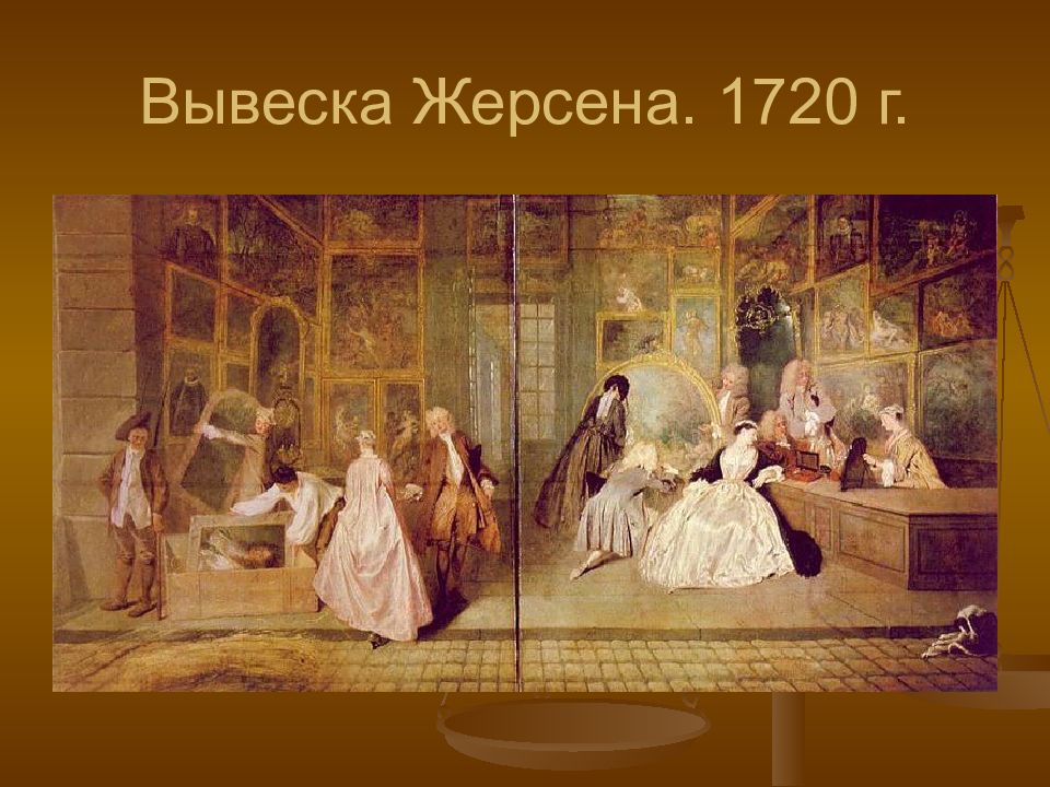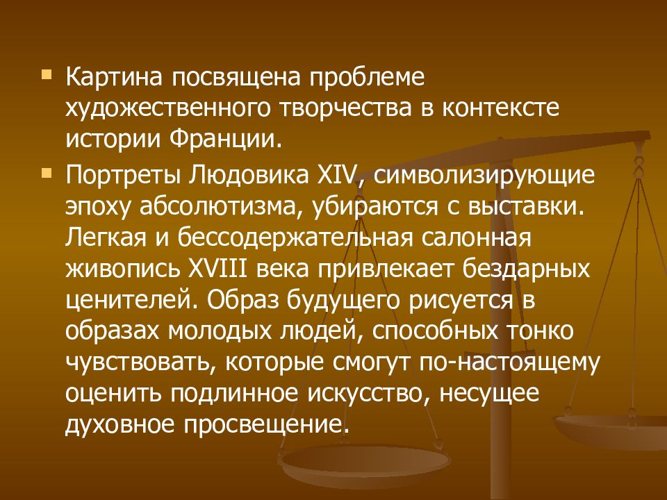Картина посвящена проблеме художественного творчества в контексте истории Франции. Портреты Людовика XIV, символизирующие эпоху абсолютизма, убираются с выставки. Легкая и бессодержательная салонная живопись XVIII века привлекает бездарных ценителей. Образ будущего рисуется в образах молодых людей, способных тонко чувствовать, которые смогут по-настоящему оценить подлинное искусство, несущее духовное просвещение.