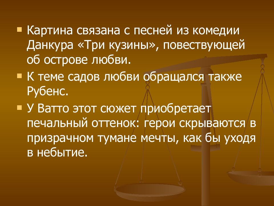 Картина связана с песней из комедии Данкура «Три кузины», повествующей об острове любви. К теме садов любви обращался также Рубенс. У Ватто этот сюжет приобретает печальный оттенок: герои скрываются в призрачном тумане мечты, как бы уходя в небытие.