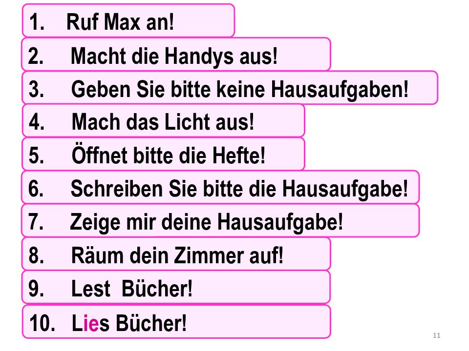 an rufen, Max (du) aus machen, die Handys (ihr) keine Hausaufgaben, geben, bitte, Sie aus machen, das Licht (du) öffnen, die Hefte, bitte (ihr) schreiben, die Hausaufgabe, Sie, bitte zeigen, deine Hausaufgaben, mir (du) auf räumen, dein Zimmer (du) lesen, Bücher (ihr) lesen, Bücher, (du) 1. Ruf Max an! 2. Macht die Handys aus! 3. Geben Sie bitte keine Hausaufgaben! 4. Mach das Licht aus! 5. Öffnet bitte die Hefte! 6. Schreiben Sie bitte die Hausaufgabe! 7. Zeige mir deine Hausaufgabe! 8. Räum dein Zimmer auf! 9. Lest Bücher! 10. L ie s Bücher! 11