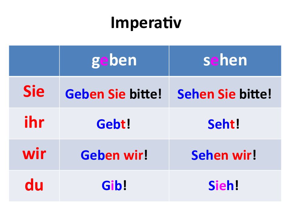 g e ben s e hen Sie ihr wir du Geb en Sie bitte! Seh en Sie bitte! Geb t ! Seh t ! Geb en wir ! Seh en wir ! G i b ! S ie h !