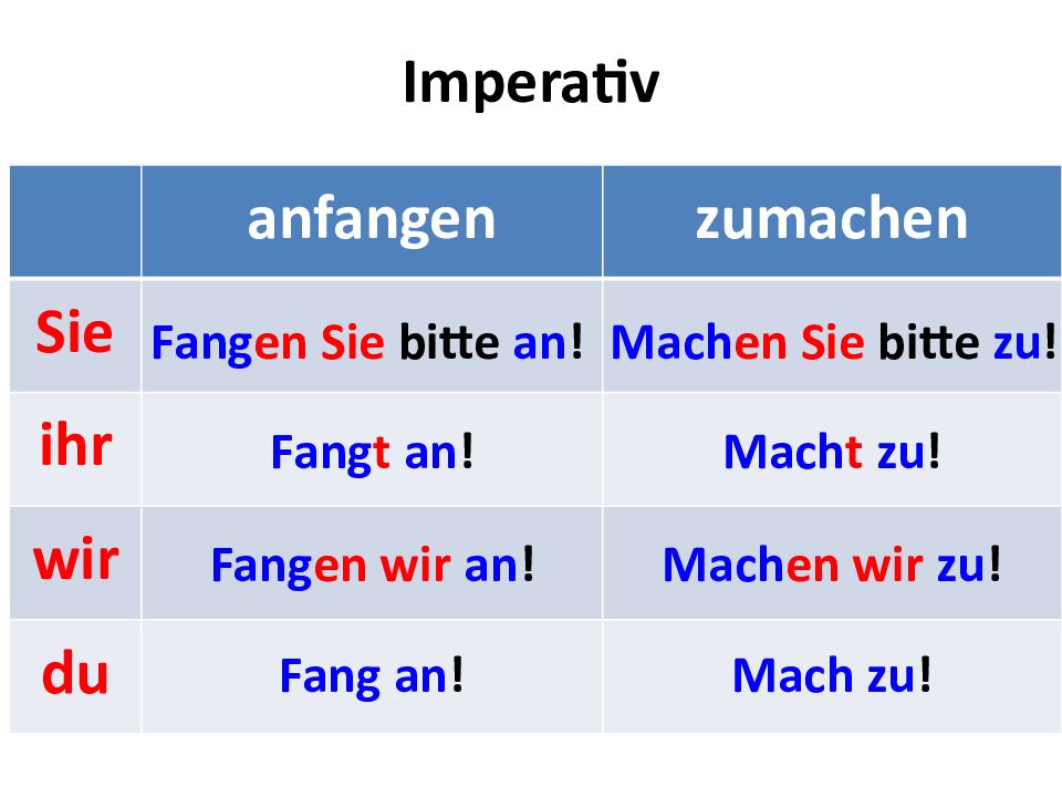anfangen zumachen Sie ihr wir du Fang en Sie bitte an ! Mach en Sie bitte zu ! Fang t an ! Mach t zu ! Fang en wir an ! Mach en wir zu ! Fang an ! Mach zu !
