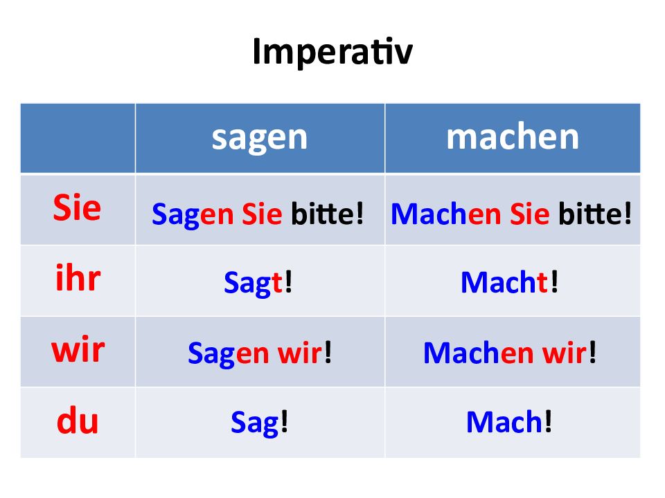 sagen machen Sie ihr wir du Sag en Sie bitte! Mach en Sie bitte! Sag t ! Mach t ! Sag en wir ! Mach en wir ! Sag ! Mach !