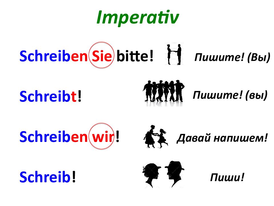 Schreib en Sie bitte! Schreib t ! Schreib en wir ! Schreib ! Пишите! (Вы) Пишите! (вы) Давай напишем! Пиши!