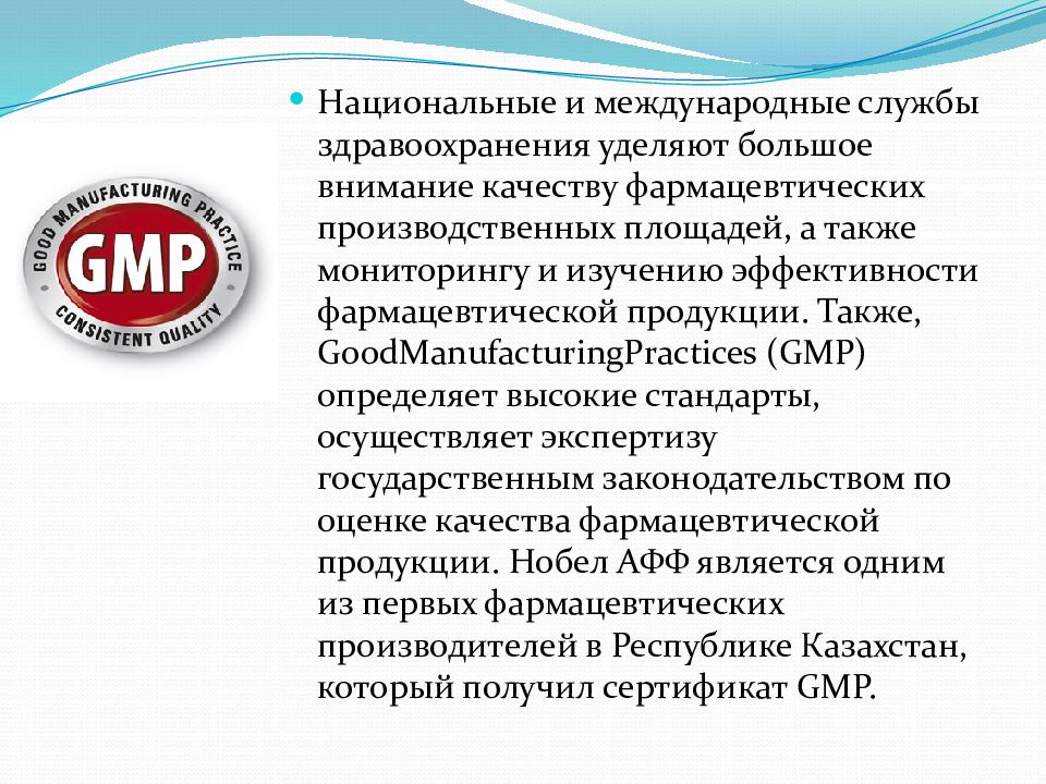 Национальные и международные службы здравоохранения уделяют большое внимание качеству фармацевтических производственных площадей, а также мониторингу и изучению эффективности фармацевтической продукции. Также, GoodManufacturingPractices (GMP) определяет высокие стандарты, осуществляет экспертизу государственным законодательством по оценке качества фармацевтической продукции. Нобел АФФ является одним из первых фармацевтических производителей в Республике Казахстан, который получил сертификат GMP.