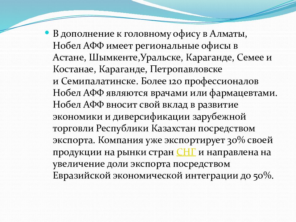 В дополнение к головному офису в Алматы, Нобел АФФ имеет региональные офисы в Астане, Шымкенте,Уральске, Караганде, Семее и Костанае, Караганде, Петропавловске и Семипалатинске. Более 120 профессионалов Нобел АФФ являются врачами или фармацевтами. Нобел АФФ вносит свой вклад в развитие экономики и диверсификации зарубежной торговли Республики Казахстан посредством экспорта. Компания уже экспортирует 30% своей продукции на рынки стран СНГ и направлена на увеличение доли экспорта посредством Евразийской экономической интеграции до 50%.