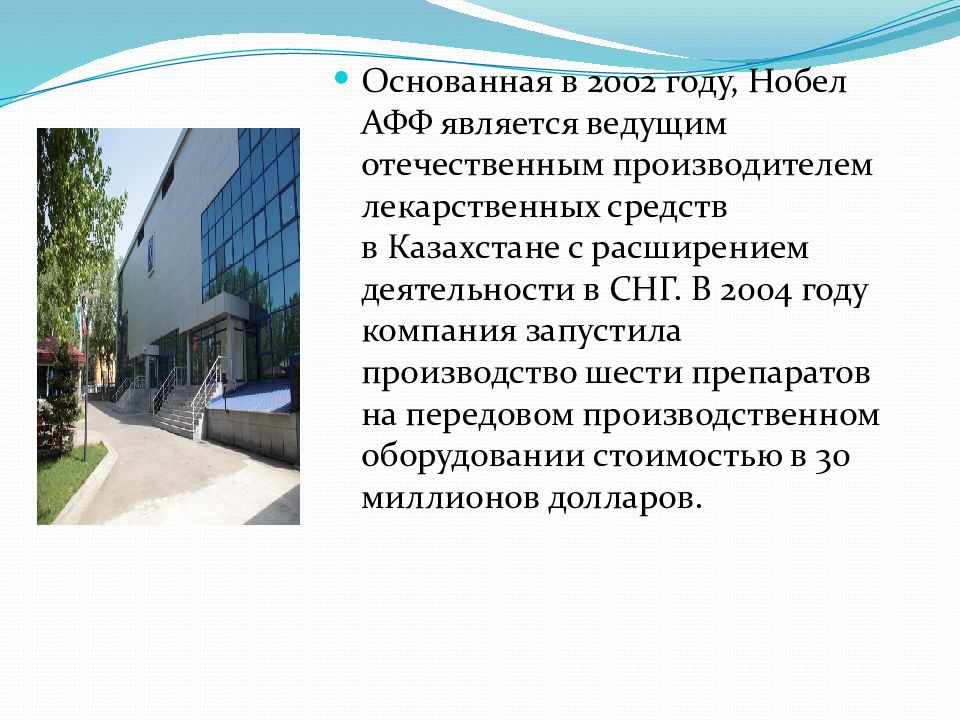 Основанная в 2002 году, Нобел АФФ является ведущим отечественным производителем лекарственных средств в Казахстане с расширением деятельности в СНГ. В 2004 году компания запустила производство шести препаратов на передовом производственном оборудовании стоимостью в 30 миллионов долларов.