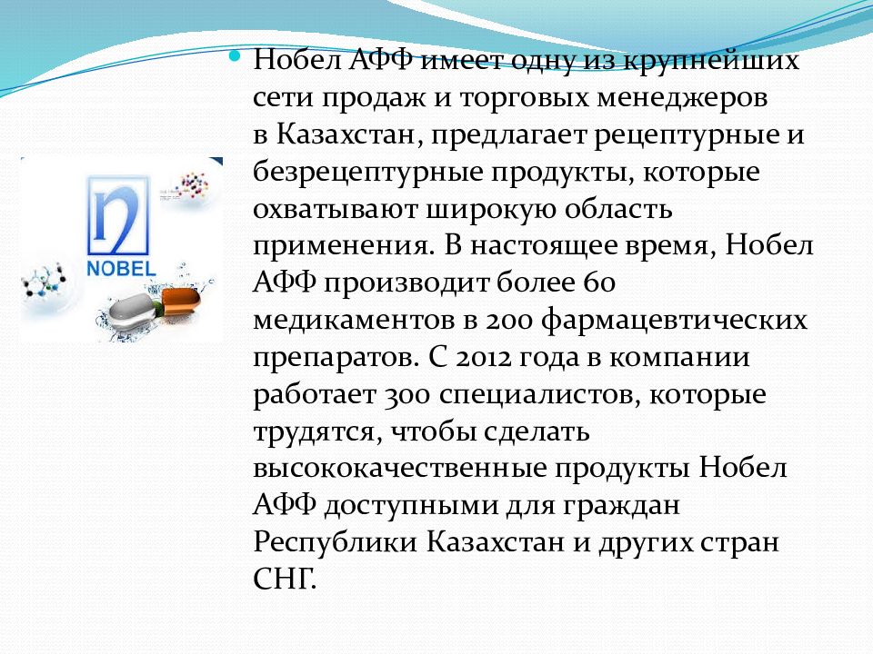 Нобел АФФ имеет одну из крупнейших сети продаж и торговых менеджеров в Казахстан, предлагает рецептурные и безрецептурные продукты, которые охватывают широкую область применения. В настоящее время, Нобел АФФ производит более 60 медикаментов в 200 фармацевтических препаратов. С 2012 года в компании работает 300 специалистов, которые трудятся, чтобы сделать высококачественные продукты Нобел АФФ доступными для граждан Республики Казахстан и других стран СНГ.