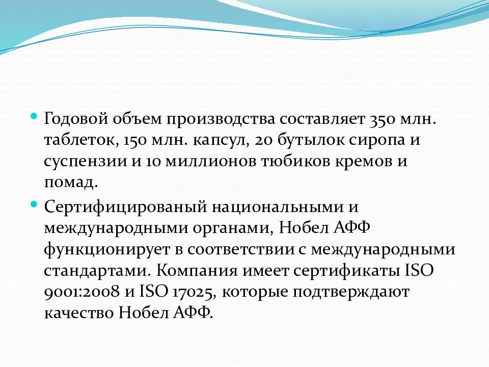 Годовой объем производства составляет 350 млн. таблеток, 150 млн. капсул, 20 бутылок сиропа и суспензии и 10 миллионов тюбиков кремов и помад. Сертифицированый национальными и международными органами, Нобел АФФ функционирует в соответствии с международными стандартами. Компания имеет сертификаты ISO 9001:2008 и ISO 17025, которые подтверждают качество Нобел АФФ.