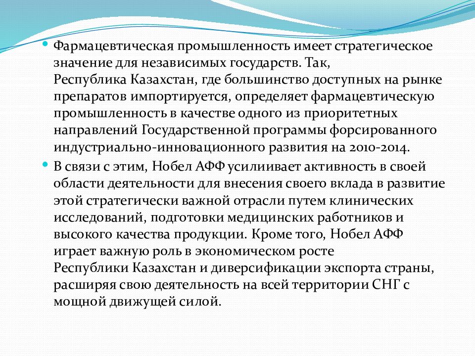 Фармацевтическая промышленность имеет стратегическое значение для независимых государств. Так, Республика Казахстан, где большинство доступных на рынке препаратов импортируется, определяет фармацевтическую промышленность в качестве одного из приоритетных направлений Государственной программы форсированного индустриально-инновационного развития на 2010-2014. В связи с этим, Нобел АФФ усилиивает активность в своей области деятельности для внесения своего вклада в развитие этой стратегически важной отрасли путем клинических исследований, подготовки медицинских работников и высокого качества продукции. Кроме того, Нобел АФФ играет важную роль в экономическом росте Республики Казахстан и диверсификации экспорта страны, расширяя свою деятельность на всей территории СНГ с мощной движущей силой.
