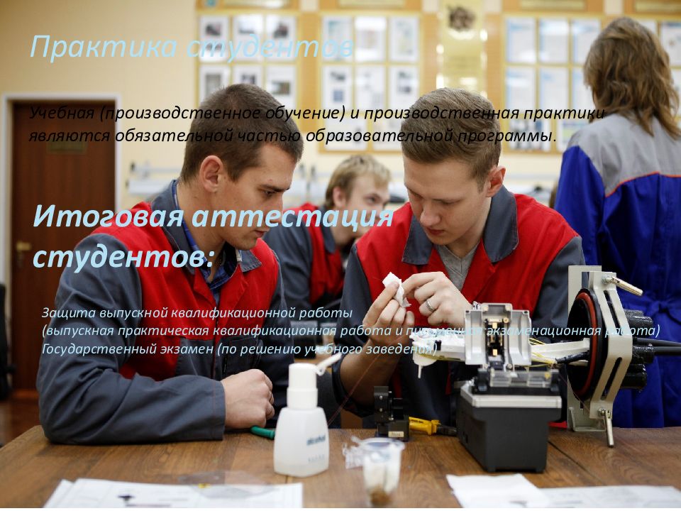 Защита выпускной квалификационной работы ( выпускная практическая квалификационная работа и письменная экзаменационная работа) Государственный экзамен (по решению учебного заведения) Итоговая аттестация студентов: Учебная (производственное обучение) и производственная практики являются обязательной частью образовательной программы. Практика студентов