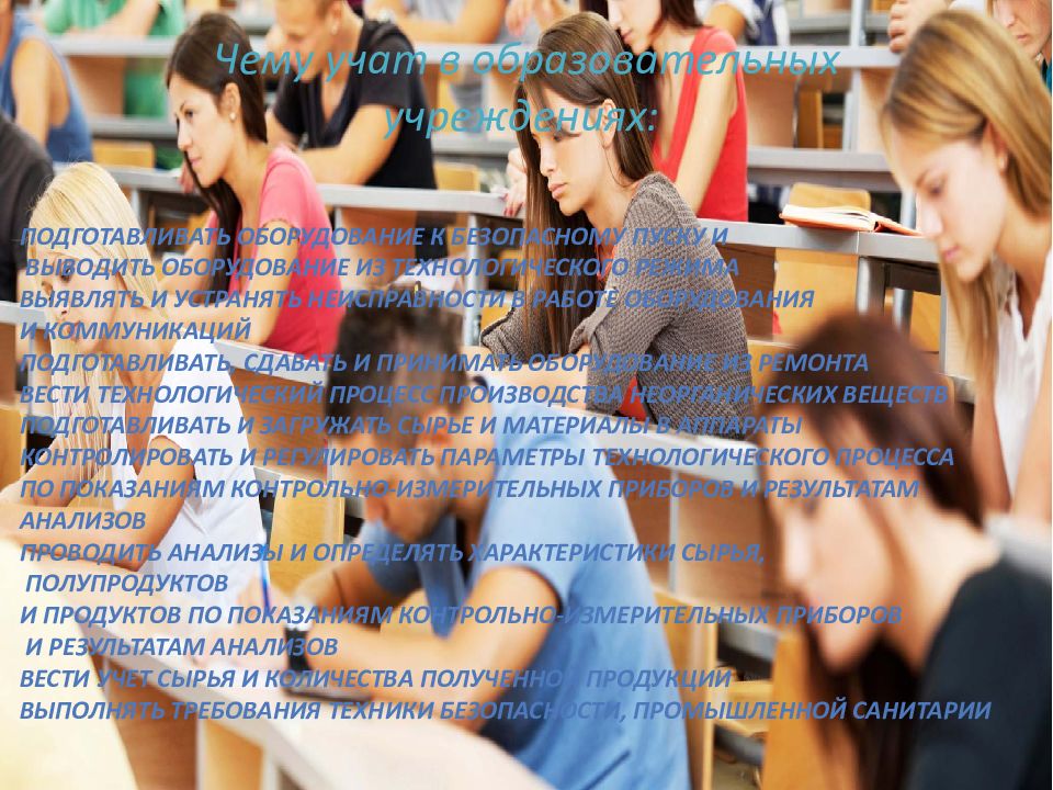 Чему учат в образовательных учреждениях: Подготавливать оборудование к безопасному пуску и выводить оборудование из технологического режима Выявлять и устранять неисправности в работе оборудования и коммуникаций Подготавливать, сдавать и принимать оборудование из ремонта Вести технологический процесс производства неорганических веществ Подготавливать и загружать сырье и материалы в аппараты Контролировать и регулировать параметры технологического процесса по показаниям контрольно-измерительных приборов и результатам анализов Проводить анализы и определять характеристики сырья, полупродуктов и продуктов по показаниям контрольно-измерительных приборов и результатам анализов Вести учет сырья и количества полученной продукции Выполнять требования техники безопасности, промышленной санитарии