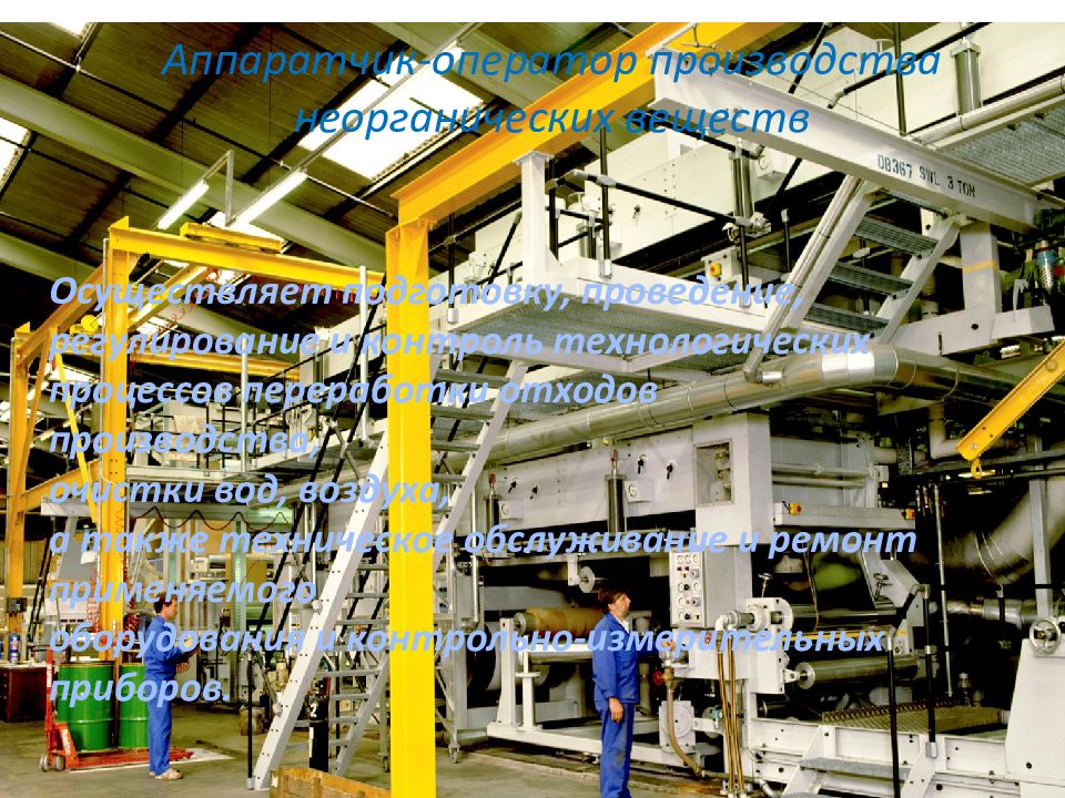 Аппаратчик-оператор производства неорганических веществ Осуществляет подготовку, проведение, регулирование и контроль технологических процессов переработки отходов производства, очистки вод, воздуха, а также техническое обслуживание и ремонт применяемого оборудования и контрольно-измерительных приборов.