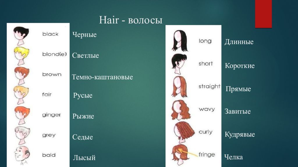Черные Светлые Темно-каштановые Русые Рыжие Седые Лысый Длинные Короткие Прямые Завитые Кудрявые Челка