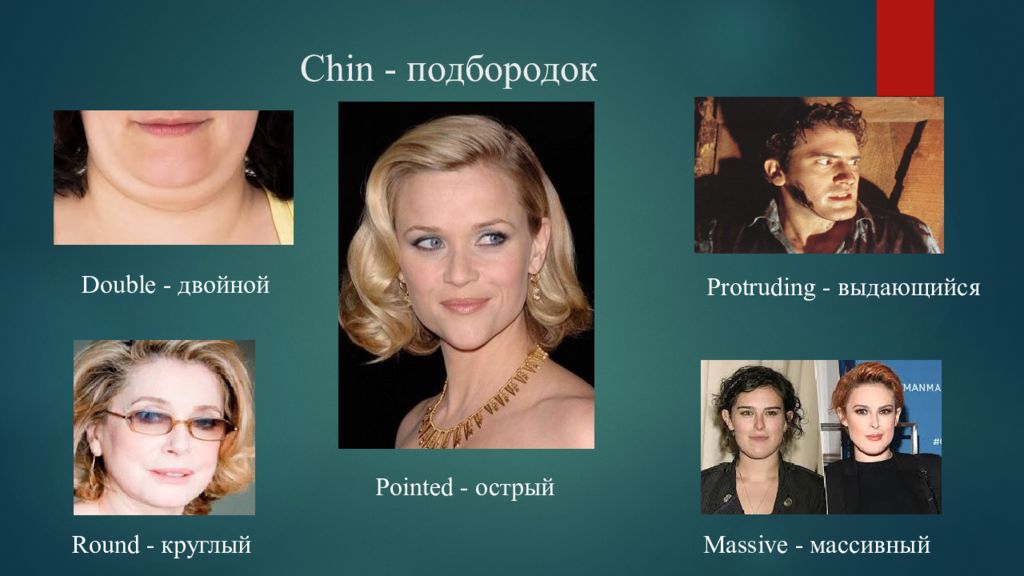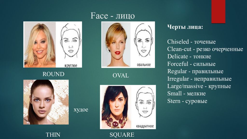 ROUND OVAL THIN SQUARE худое Черты лица: Chiseled - точеные Clean-cut - резко очерченные Delicate - тонкие For с eful - сильные Regular - правильные Irregular - неправильные Large/massive - крупные Small - мелкие Stern - суровые