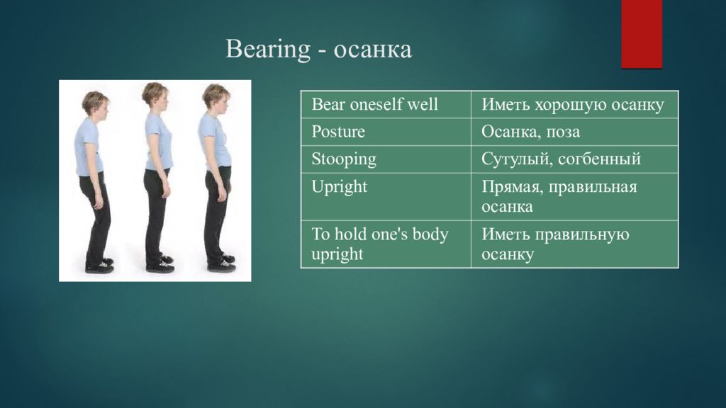 Bear oneself well Иметь хорошую осанку Posture Осанка, поза Stooping Сутулый, согбенный Upright Прямая, правильная осанка To hold one's body upright Иметь правильную осанку