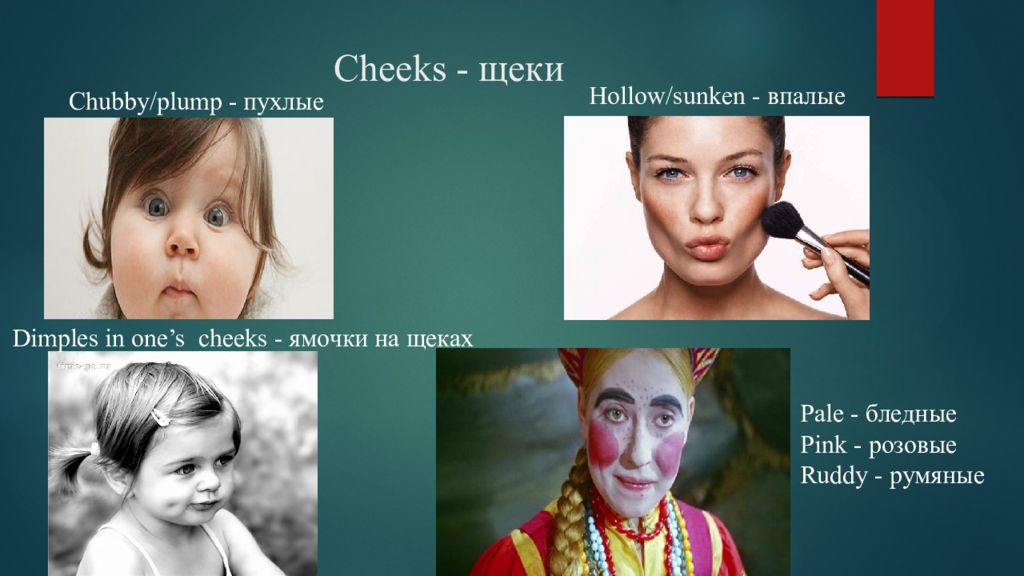 Chubby/plump - пухлые Hollow/sunken - впалые Dimples in one’s cheeks - ямочки на щеках Pale - бледные Pink - розовые Ruddy - румяные
