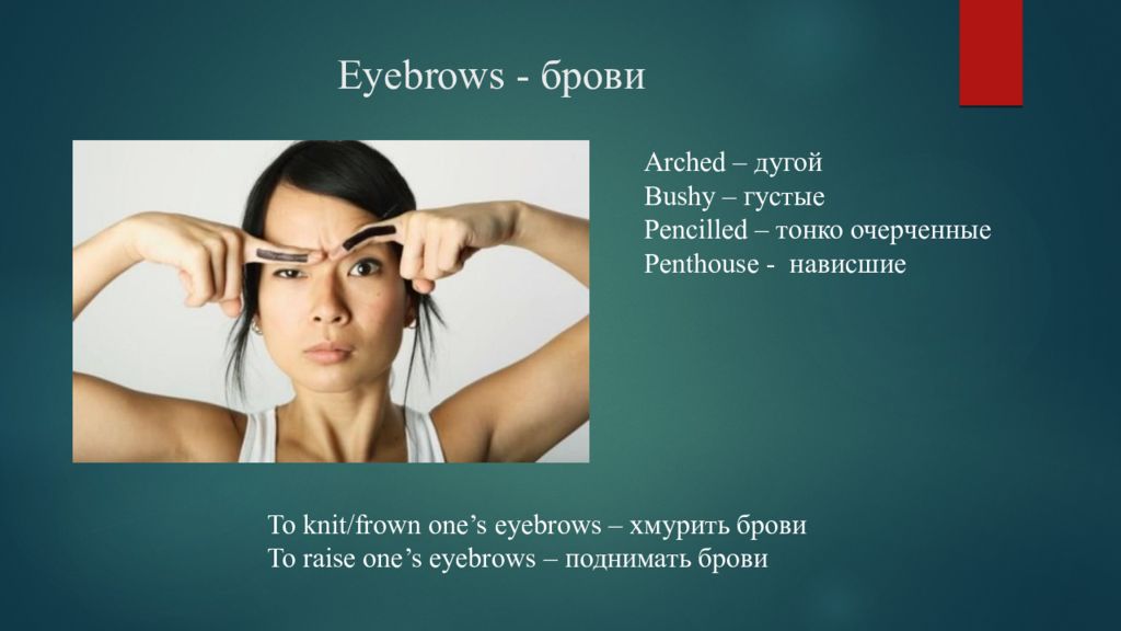 Arched – дугой Bushy – густые Pencilled – тонко очерченные Penthouse - нависшие To knit/frown one’s eyebrows – хмурить брови To raise one’s eyebrows – поднимать брови