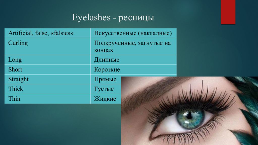 Artificial, false, «falsies» Искусственные (накладные) Curling Подкрученные, загнутые на концах Long Длинные Short Короткие Straight Прямые Thick Густые Thin Жидкие