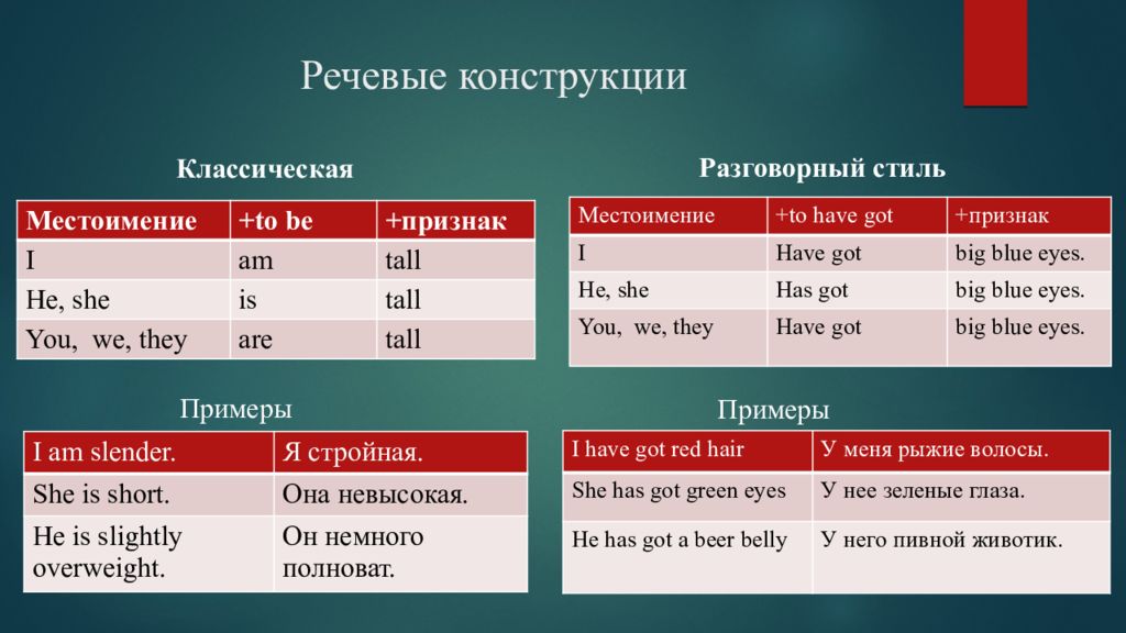 Местоимение + to be + признак I am tall He, she is tall You, we, they are tall Классическая I am slender. Я стройная. She is short. Она невысокая. He is slightly overweight. Он немного полноват. Примеры Местоимение + to have got + признак I Have got big blue eyes. He, she Has got big blue eyes. You, we, they Have got big blue eyes. Разговорный стиль I have got red hair У меня рыжие волосы. She has got green eyes У нее зеленые глаза. He has got a beer belly У него пивной животик. Примеры