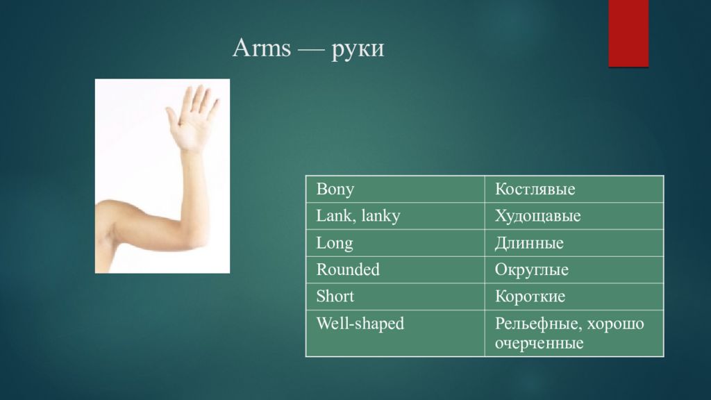 Bony Костлявые Lank, lanky Худощавые Long Длинные Rounded Округлые Short Короткие Well-shaped Рельефные, хорошо очерченные