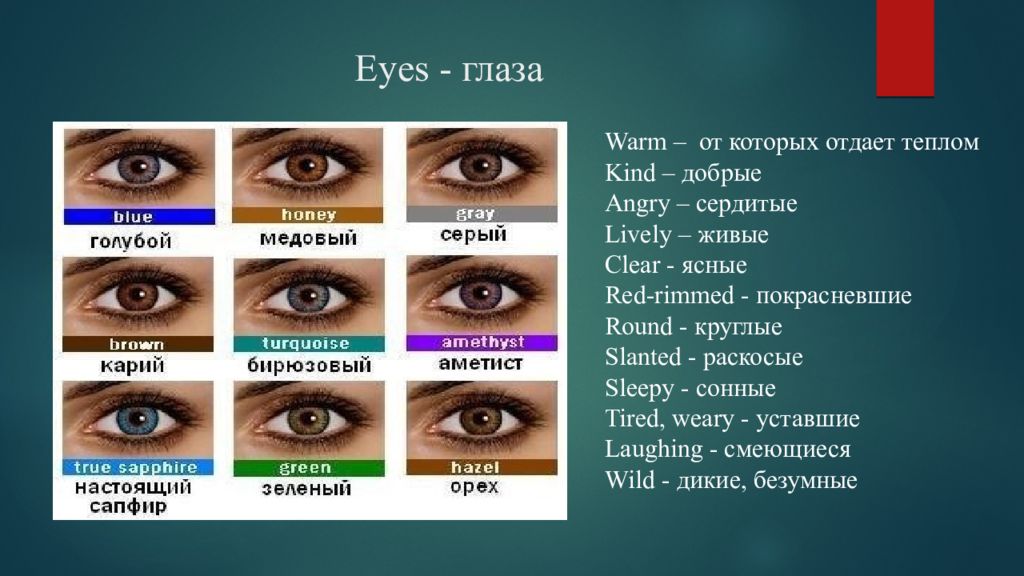 Warm – от которых отдает теплом Kind – добрые Angry – сердитые Lively – живые Clear - ясные Red-rimmed - покрасневшие Round - круглые Slanted - раскосые Sleepy - сонные Tired, weary - уставшие Laughing - смеющиеся Wild - дикие, безумные