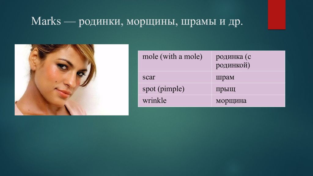 Слайд 15: Marks — родинки, морщины, шрамы и др