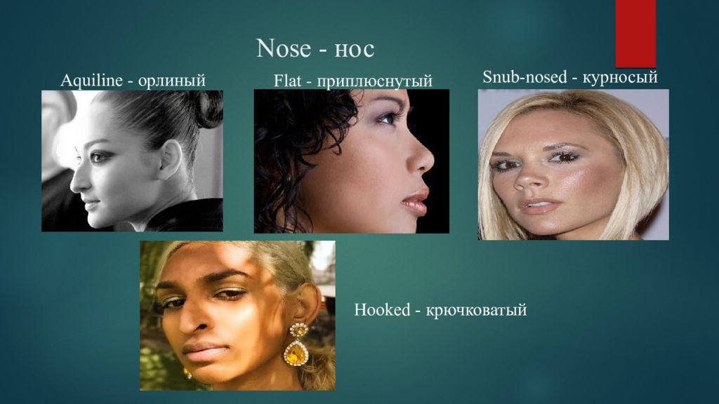 Aquiline - орлиный Flat - приплюснутый Snub-nosed - курносый Hooked - крючковатый