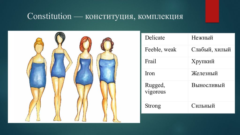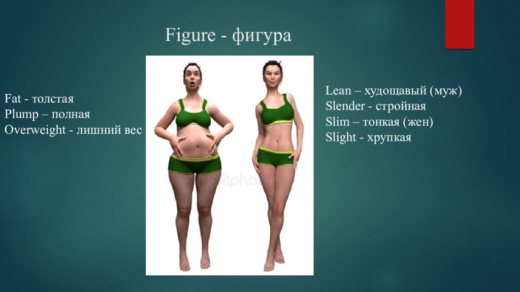 Fat - толстая Plump – полная Overweight - лишний вес Lean – худощавый (муж) Slender - стройная Slim – тонкая (жен) Slight - хрупкая