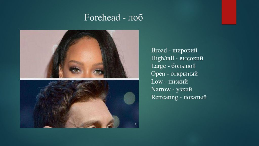 Broad - широкий High/tall - высокий Large - большой Open - открытый Low - низкий Narrow - узкий Retreating - покатый