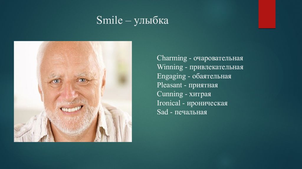 Charming - очаровательная Winning - привлекательная Engaging - обаятельная Pleasant - приятная Cunning - хитрая Ironical - ироническая Sad - печальная