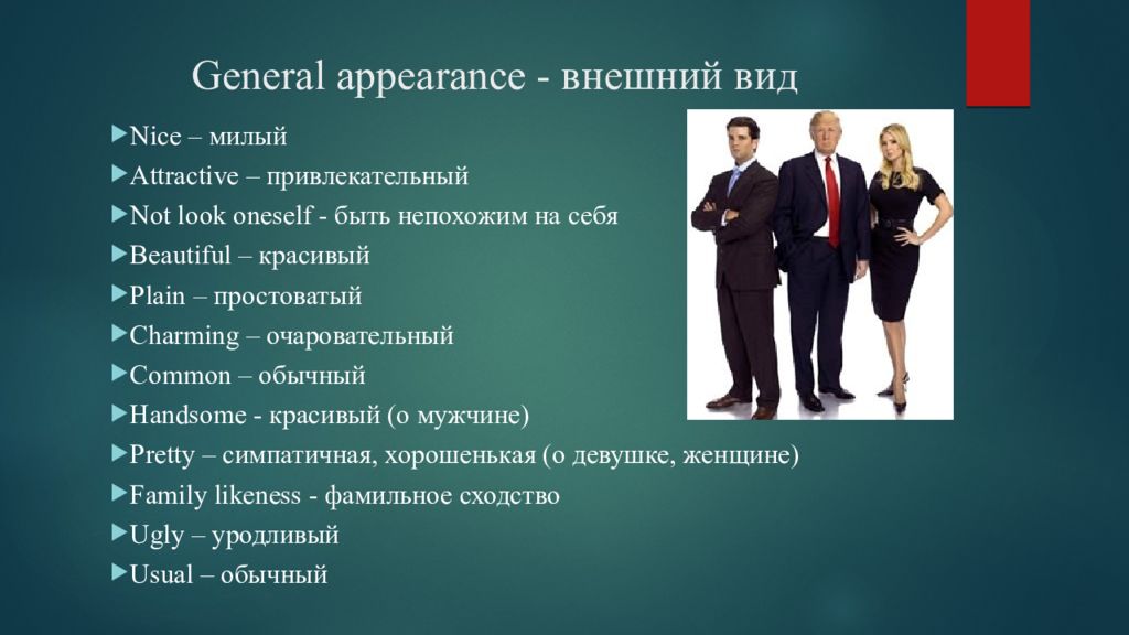 Nice – милый Attractive – привлекательный Not look oneself - быть непохожим на себя Beautiful – красивый Plain – простоватый Charming – очаровательный Common – обычный Handsome - красивый (о мужчине) Pretty – симпатичная, хорошенькая (о девушке, женщине) Family likeness - фамильное сходство Ugly – уродливый Usual – обычный