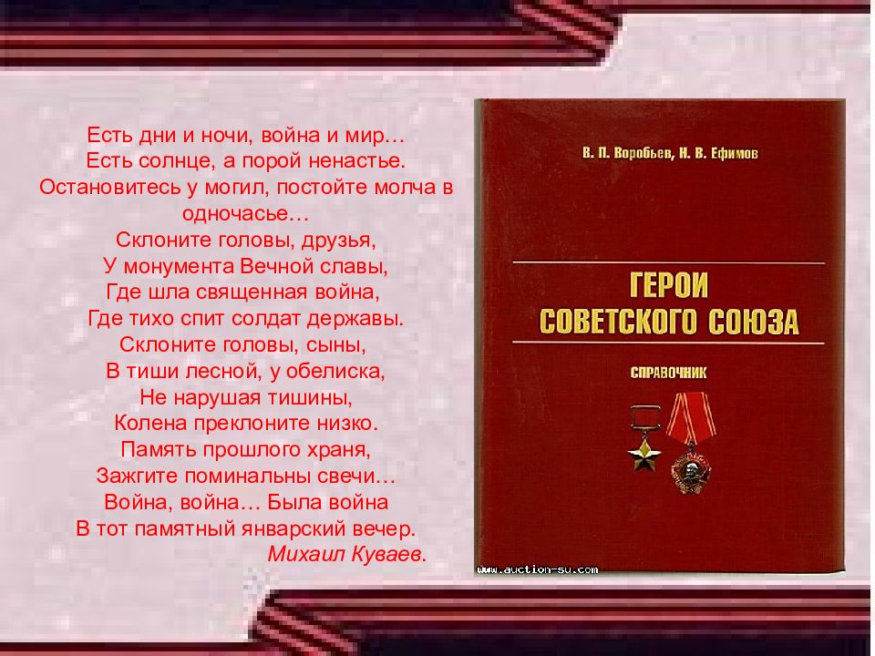 Есть дни и ночи, война и мир… Есть солнце, а порой ненастье. Остановитесь у могил, постойте молча в одночасье… Склоните головы, друзья, У монумента Вечной славы, Где шла священная война, Где тихо спит солдат державы. Склоните головы, сыны, В тиши лесной, у обелиска, Не нарушая тишины, Колена преклоните низко. Память прошлого храня, Зажгите поминальны свечи… Война, война… Была война В тот памятный январский вечер. Михаил Куваев.